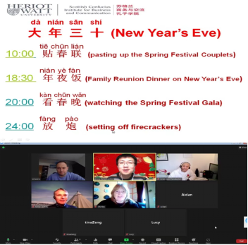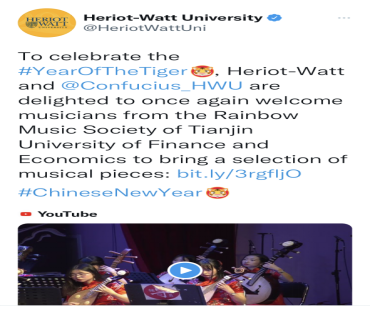为庆祝壬寅虎年新春,我校与赫瑞·瓦特大学合作共建的苏格兰商务与交流孔子学院举办了精彩纷呈的虎跃新春中国年活动。孔子学院所在大学师生和苏格兰当地民众透过云端亦或走近现场参与其中,体验浓浓的中国年味。虎跃新春中国年活动在茶艺表演活动中拉开帷幕,来自孔子学院所在大学的纺织学院师生来到活动现场,观赏中国茶艺表演,认识了解中国茶的历史和文化,在闻香品茗中感知清逸雅韵。春节期间,孔子学院利用多个社交媒体平台展播了由我校学生民乐团演奏录制的新春音乐会,悠扬婉转、激昂奔放的优美旋律,演绎出独特的中国韵味,传递出美好的中国声音,这是我校学生民乐团第八次应邀为孔子学院呈现兼具中西方元素的艺术视听盛宴;孔子学院精心策划组织的中文体验课、书法体验课、“虎年文化”讲座、《茉莉花》和《友谊地久天长》歌曲教唱等主题各异的特色活动,也让爱丁堡当地各界感受到了传统节日春节的文化内涵和中国精神。