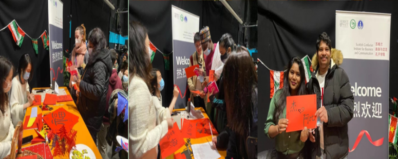 虎年新春之际,正值赫瑞·瓦特大学一年一度的全球日活动(Global Day)。孔子学院受邀参加了全球日活动展出,现场提供中国传统美食、撰写虎年特色图案的福字和中文音译姓名,并为大学师生送出免费的中文课程和2022北京冬奥会纪念品等节日惊喜,展示了孔子学院“以语言为媒,用文化交融,促民心相通”的初心使命,寄寓着以自身化作友谊之桥与两校师生“一起向未来”的盼望与愿景。