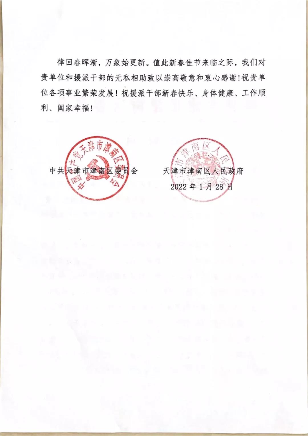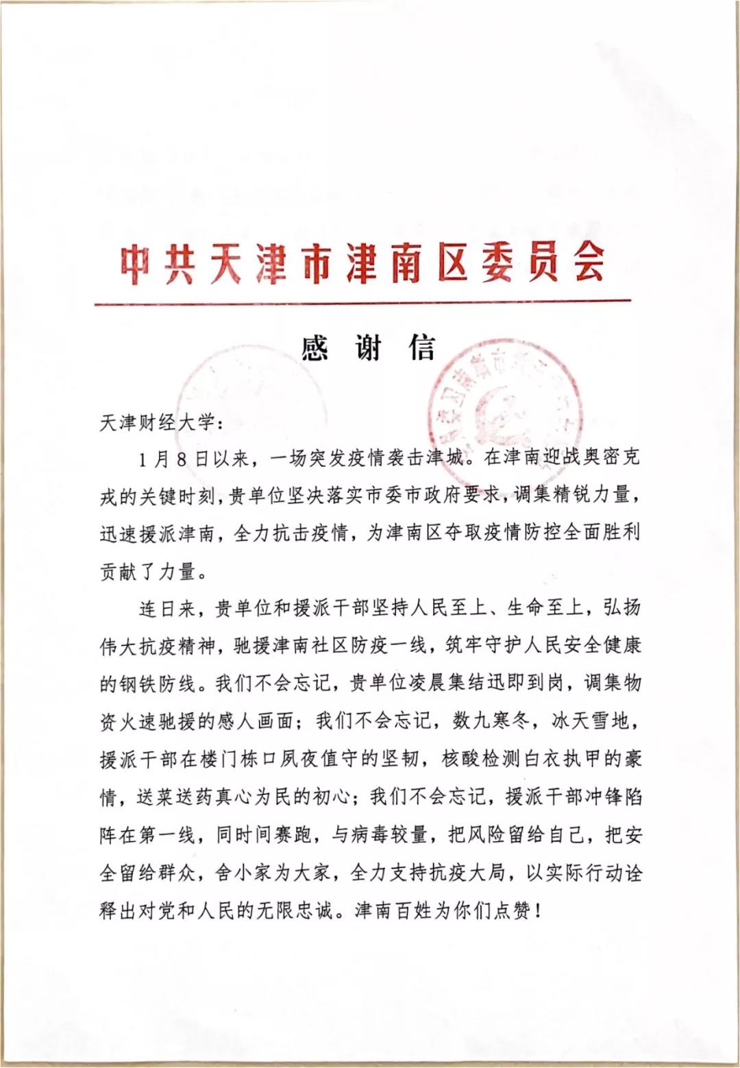 近日,我校收到了一封来自津南区党委、津南区人民政府的感谢信,对我校坚决落实市委市政府要求,调集精锐力量援派津南表示感谢,对我校援派干部连日来坚持人民至上、生命至上,连续奋战在津南社区防疫一线表示感谢。