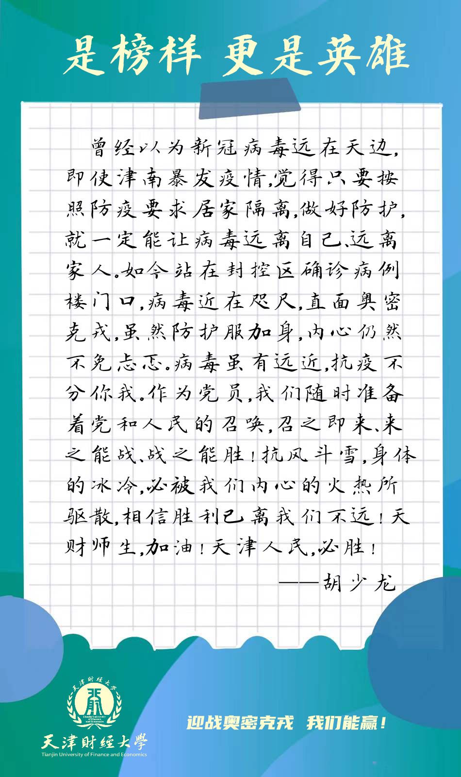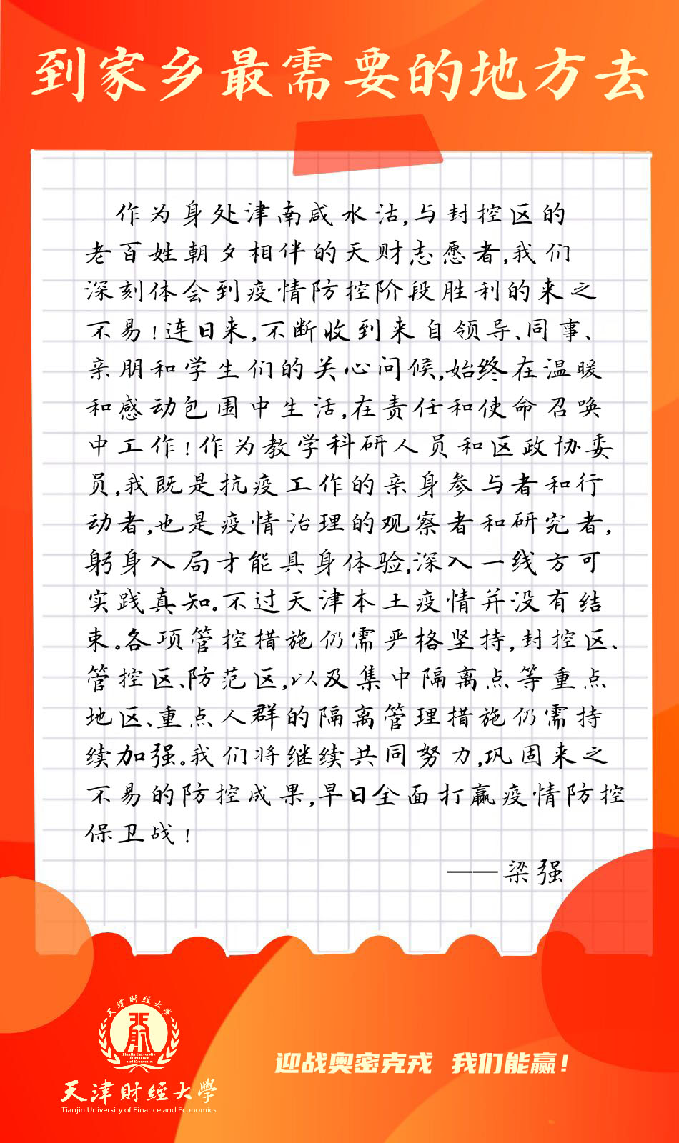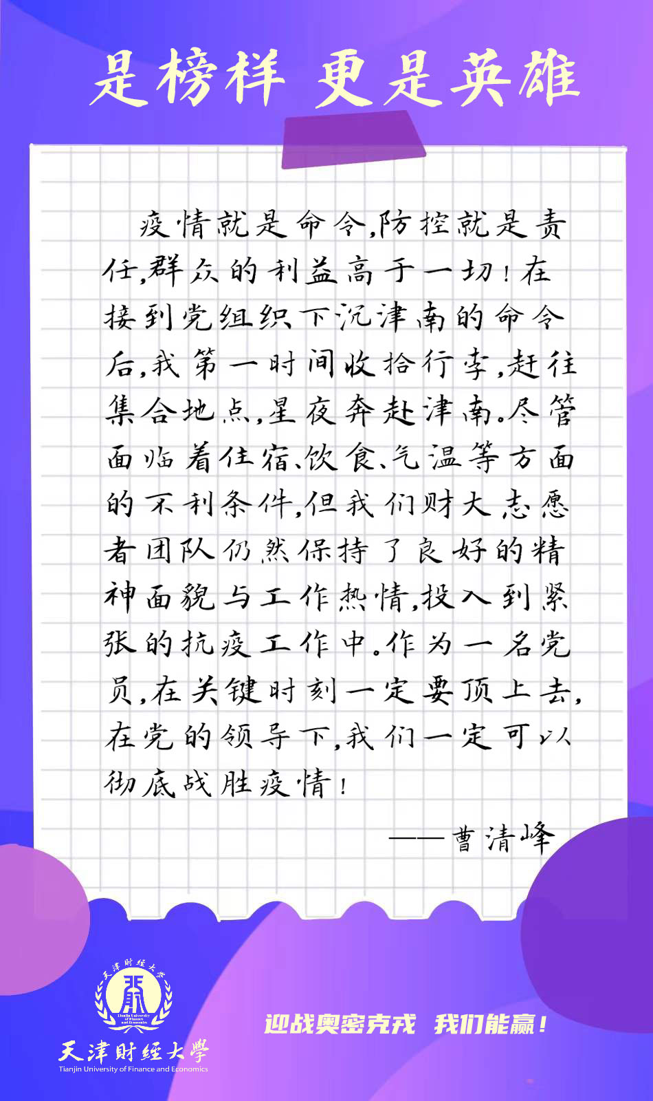 来自商学院的周永军老师一直身处联防联控的终端,又是直面潜在病患的前线,经过了多天下沉津南封控区的一线工作,周老师深感责任重大,他谈到作为普通公民,我有义务为抗疫尽绵薄之力;作为高校教育工作者,我有责任率先垂范,为人师表;作为党员,我使命在肩,绝不会辜负中国共产党员这个称号。在疫情防控中敢于挺身而出,是体现党员责任担当的试金石和磨刀石。我坚信,没有一个冬天不可逾越,没有一个春天不会来临,让我们众志成城,共渡难关,胜利必将属于我们!作为一名上个月入党的新党员,来自图书馆的郝庆合老师光荣参加了此次支援津南抗疫,承担了劝阻居民出楼、为居民送货上门、清运处理垃圾等工作。他表示,此次参与一线防疫,感受到了学校的殷切关怀、战友的互相帮助、居民的大力配合、基层工作的辛苦不易、家人的理解支持。我会继续努力,圆满完成任务。津南加油,天津必胜!