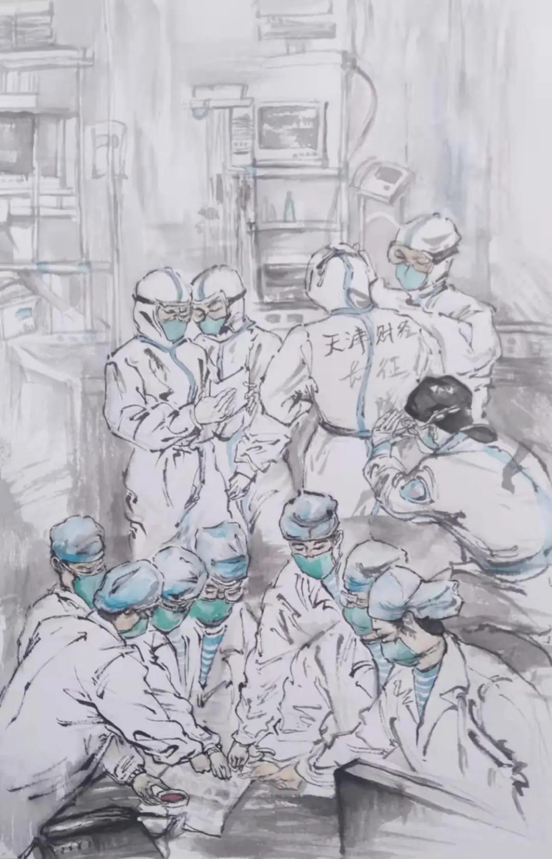 美术学专业学生徐梦谦的这幅画描述了在天津疫情严重的情况下,来自天津各个地方的志愿者们都愿意挺身出战,成为人民生命安全最坚强的守护者。表现了不到最后一刻,大家绝不放弃的决心。