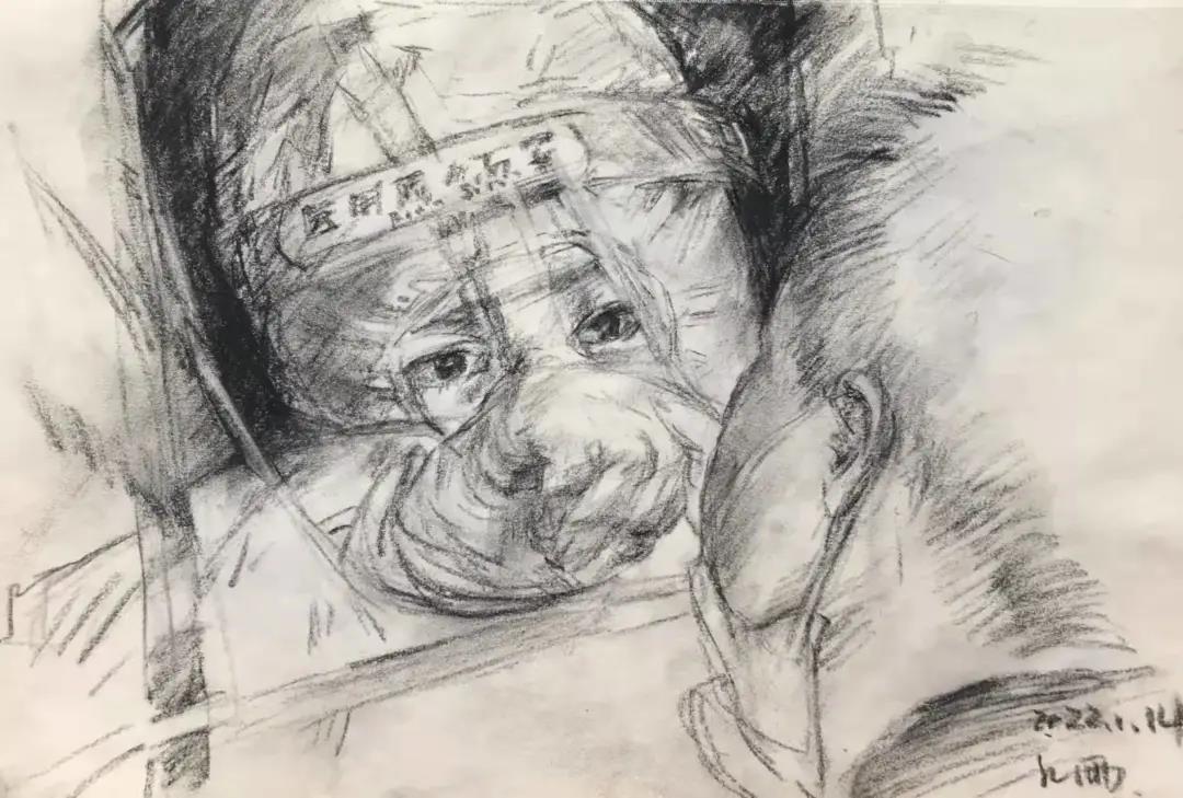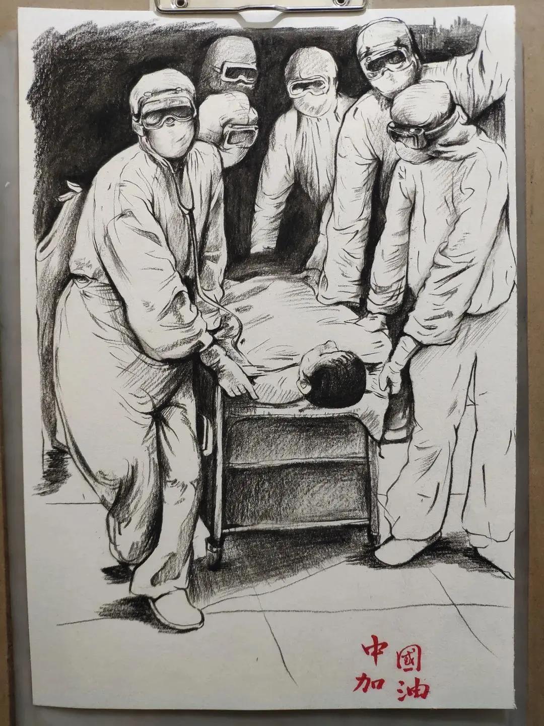 环境设计专业刘卓然的速写作品《疫中奋斗的最可爱的人》,描绘了作者在疫情期间看到的每个医护工作者甚至每一个人都讲求的仁爱之心,害怕疫苗的小朋友鼓起勇气完成任务,这种仁爱之心生发出一种大爱精神,在这次疫情防控斗争中,医护人员义无反顾奔赴抗疫最前线,同时间赛跑,与病魔较量,为抢救患者生命日夜拼搏。