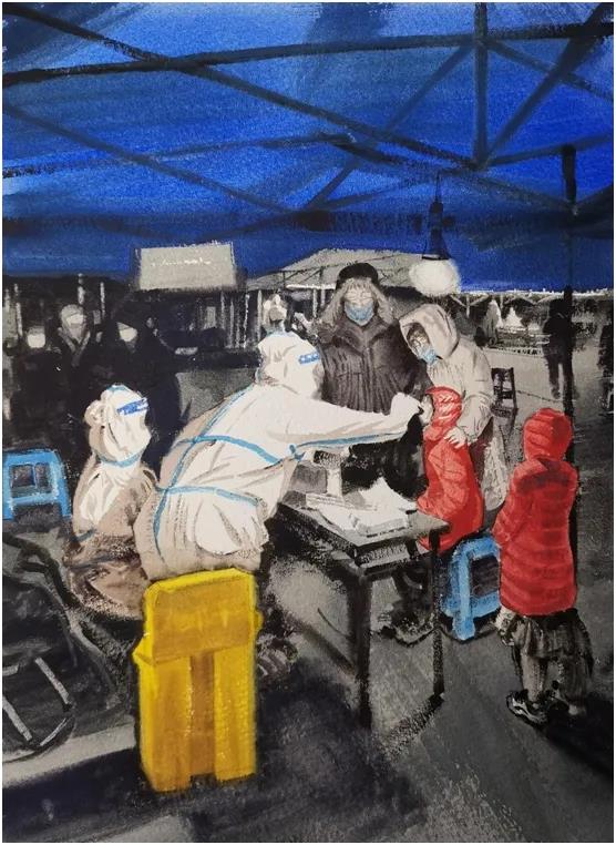 孔令伟老师的作品展现了战“疫”勇士不畏寒夜、分秒必争,群众与防疫部门守望相助、共克时艰的场景。全民核酸筛查工作不仅是与病毒的战斗,更是党和政府心系人民,向人民群众传递温暖的纽带和桥梁。用画笔记录下生动的一幕,讴歌斗志、期盼胜利,这是美术工作者应尽的责任。