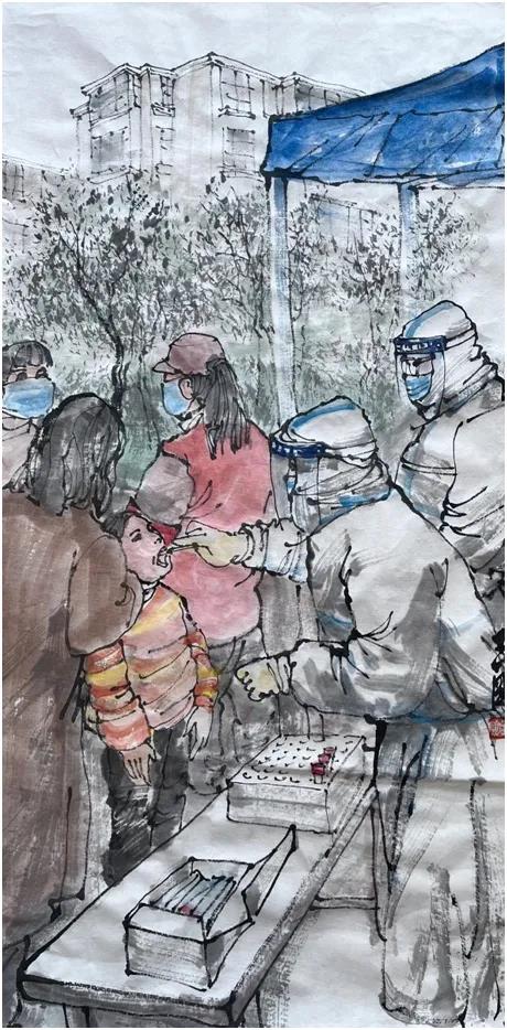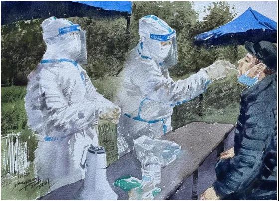 王刚老师这两幅作品,都是围绕表现在社区进行核酸检测人员的风采而创作的,冬日里的白衣天使为人民带来了信心和希望,是守护人民健康的卫士,是当今津城最可爱的人。