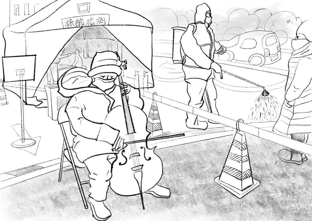 产品设计专业苏科予将看到的小朋友在核酸检测现场为工作人员演奏大提琴的视频融入画作,一首《我和我的祖国》表达了对医护人员的敬意,也体现了对祖国和家乡的热爱,作者将这个画面记录下来,希望疫情早日结束,并向所有奋斗在抗疫一线的工作者说一声:“您辛苦了!希望天津早日战胜疫情,迎接春天的到来。