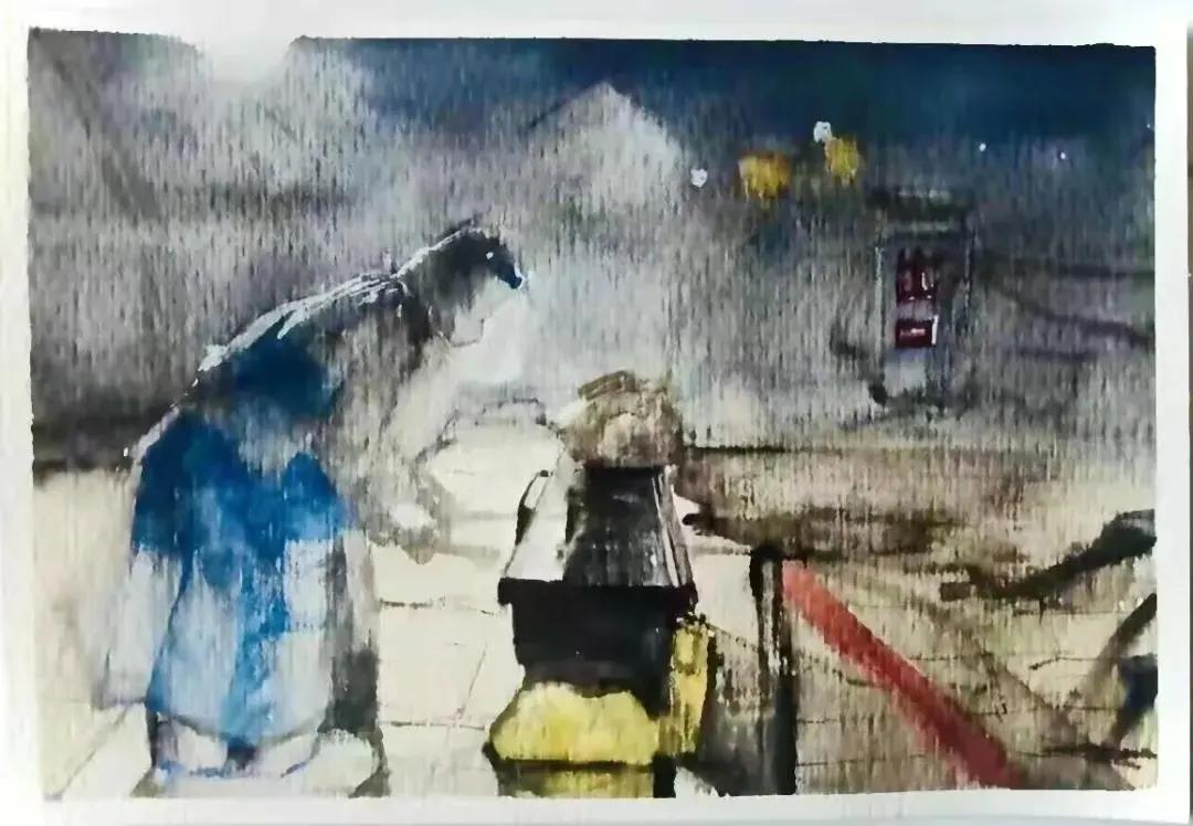 环境设计专业董欣然的水彩作品《疫年好景君须记,最是橙黄橘绿时》,描绘了志愿者不分昼夜地坚守在社区一线,他们身披防护服,脚踏防护靴,灯光毫无保留地倾洒他们身,他们毫无保留地温暖我们心。天气的寒冷抵挡不住我们抗疫的决心。作品的右上方,用“出口”二字寓意希望,没有一个冬天不可逾越,没有一个春天不会来临。