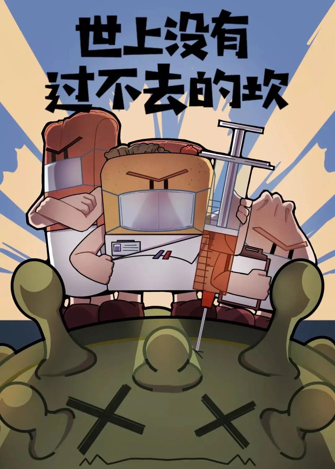 视觉传达设计专业王惜羽用画作为天津的抗疫工作加油,将天津的特色美食,油条、狗不理包子和煎饼果子与抗击疫情相结合。赋予这些食物生动的人物形象,采用逆光打光,人物们将病毒踩在脚下,背后是亮光的爆炸。表达对天津抗疫必胜的美好祝福,和对一线工作人员的赞扬与感激。
