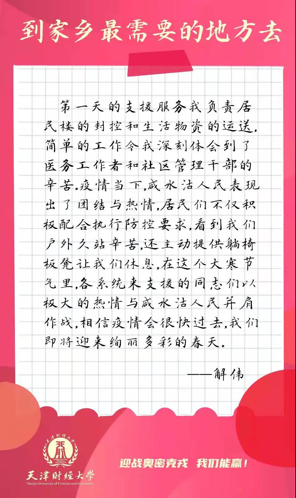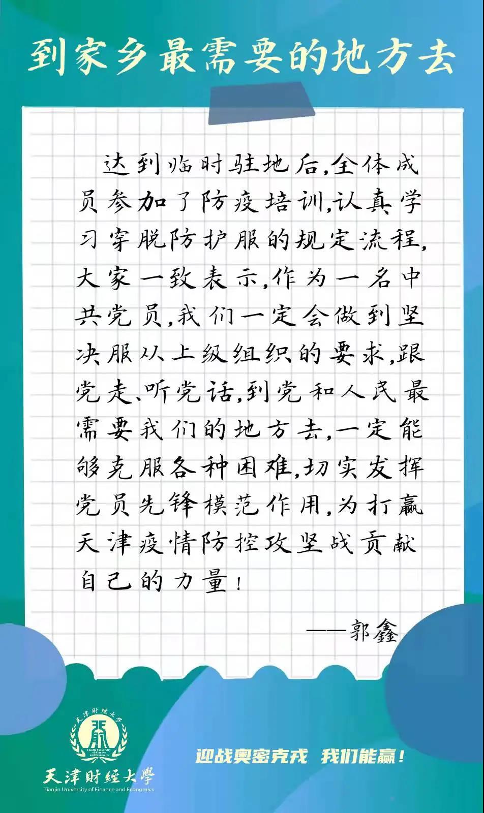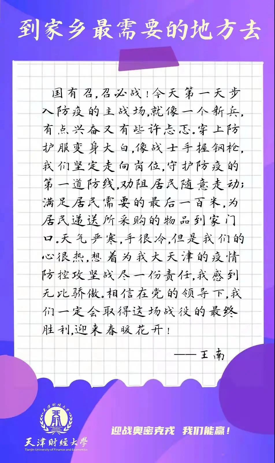 虽然在这过程中,老师们仍然会面临持续在零度气温下工作双手已被冻得发紫而麻木等等无法避免的“小”问题,但流淌在身体里始终想为家乡出力“经世济民”的天财热血难凉,全力阻断疫情传播渠道,充分发挥党员干部先锋模范作用,以实际行动为全力筑牢疫情防控网提供重要力量支撑。关键时刻,老师们走下讲台,做到了“走在前、作表率”,用实际行动把人民至上、生命至上理念落实于疫情防控的具体行动中,为学生上了一节生动的抗疫思政课。