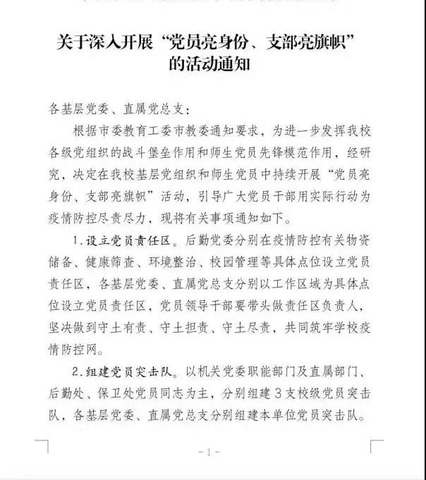 按照市委组织部、市教育两委通知要求,在校党委统一安排部署下,疫情初始,我校就第一时间发出通知,号召全校各级党组织和党员干部在疫情防控工作中要充分发挥战斗堡垒和先锋模范作用,持续深入开展“党员亮身份、支部亮旗帜”活动。通过设立党员责任区、组建党员突击队,严格落实党员领导干部包院系、包重点区域、辅导员包班、包人、包宿舍等工作机制,切实筑牢了疫情防控组织网。很多党员领导干部身先士卒、冲锋在前,发挥了很好的示范带动作用。