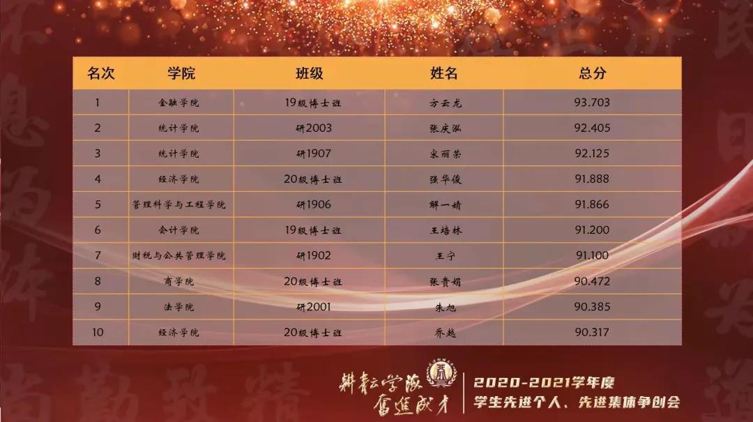经过激烈角逐,李雨晨等十名同学获评校级“十佳大学生”荣誉称号,鲍丹等十名同学获评校级“十佳大学生”入围奖;方云龙等十名同学获评校级“优秀研究生”荣誉称号。
