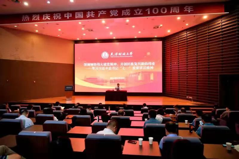 为深入学习宣传贯彻习近平总书记在庆祝中国共产党成立100周年大会上的重要讲话精神,深刻领悟伟大建党精神,持续推进党史学习教育深入开展,9月23日上午,学校举办学习贯彻习近平总书记“七一”重要讲话精神专题宣讲报告会。党史学习教育中央宣讲团成员、天津大学马克思主义学院院长颜晓峰教授应邀来到天财园,聚焦伟大建党精神,以《深刻领悟伟大建党精神开创民族复兴新的伟业》为题进行专题宣讲。