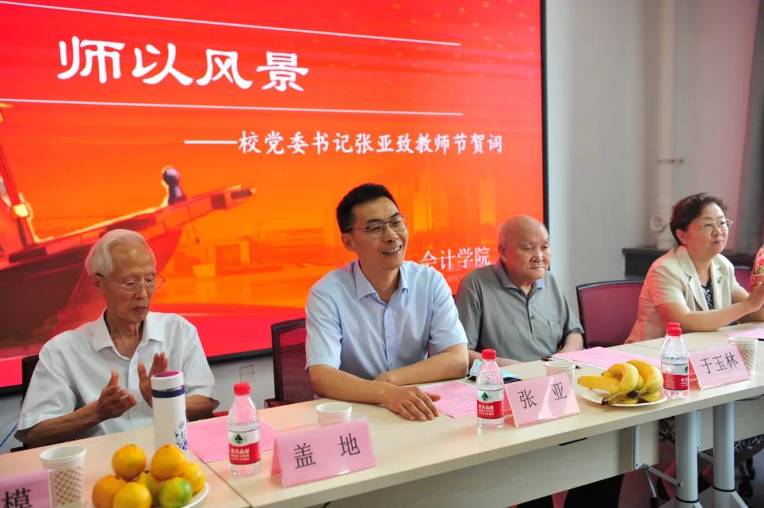 校党委书记张亚对会计学院和全校的教师致以节日的祝贺和问候!他在致词中指出,教师肩负着党的嘱托、时代的重任、人民的期盼,要弘扬高尚师德,加强能力建设,落实立德树人根本任务。教师做学生为学、为人、为事的典范,做合格的“大先生”,要坚守道德的底线、追求学术研究的高线。张亚书记还以精准翔实的数据分析了会计学院的现状,言谈话语间,表达了对学院教师的鼓励,也对新入职的教师提出了殷切的希望。