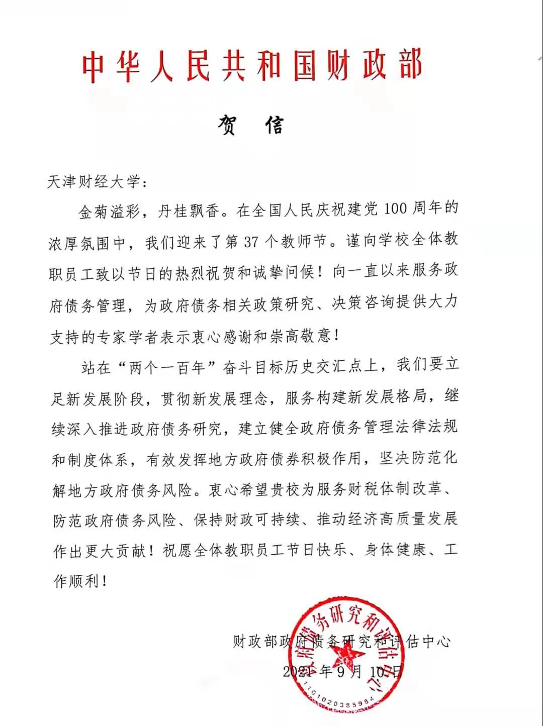 2019年12月,我校与财政部政府债务研究和评估中心签署《合作研究与人才培养框架合作协议》,并共建“地方政府债务研究中心(财政风险测评实验室)”,以此进一步促进学校学术研究贴近经济社会发展,使科学研究紧密对接国家财政宏观决策和顶层制度设计。共建平台成立以来,我校专家学者积极参与财政部政府债务研究和评估中心的学术交流活动,积极组织团队深入开展地方债专题研究,初步取得了一定的研究成果。值此教师节之际,财政部政府债务研究和评估中心专门向学校发来贺信,祝福全体教职工节日快乐。