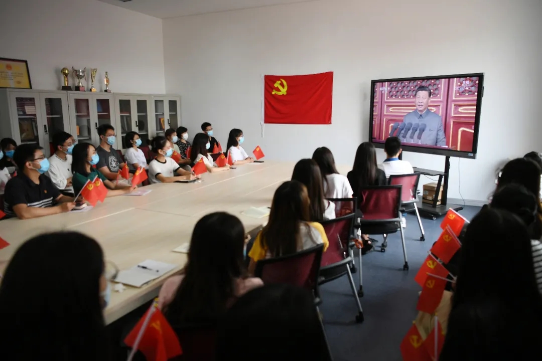 今天,天财人的朋友圈里有个共同的颜色,就是属于独特的中国红!鲜红的党旗巍巍飘扬,醒目的100字样昭示着伟大的党的光荣历程。我校各部门、各学院师生也组织进行了集中收听收看。