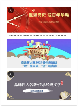 今年是中国共产党成立100周年,习近平总书记明确指出要学史明理、学史增信、学史崇德、学史力行。为弘扬爱国主义,增强读者民族自豪感,满足广大读者文化需求,我馆联合相关机构举办“辉煌百年,共忆荣光”党史主题线上知识竞赛活动,以期更好地继承和发扬党的光荣传统,做到知史爱党、知史爱国。此外,还举办了“品味四大名著·传承经典文学”、“2021森途杯大赛”等线上知识竞答,在丰富校园文化,拓展知识层面起到了促进作用。