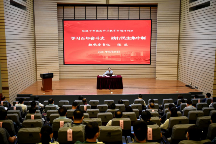为深入贯彻落实习近平总书记在党史学习教育动员大会上的重要讲话精神,落实市委相关要求,充分发挥领导干部在党史学习教育中的示范带动作用,根据学校工作安排,5月25日,学校党委开展处级领导干部党史教育专题培训,校党委书记张亚作专题讲座。校党委副书记侯洁、马岩,校党委常委、副校长廉军出席,全体处级领导干部和青年干部教师代表聆听讲座。