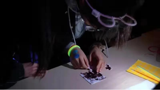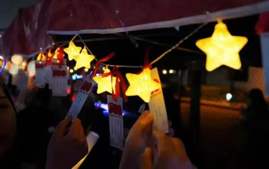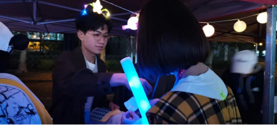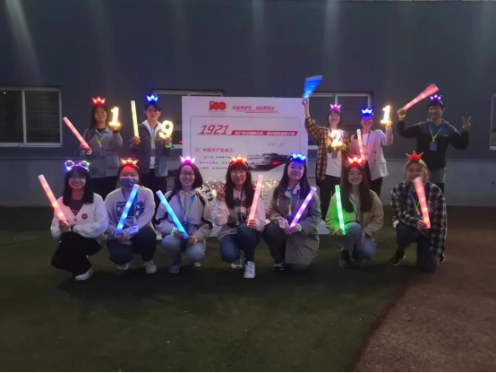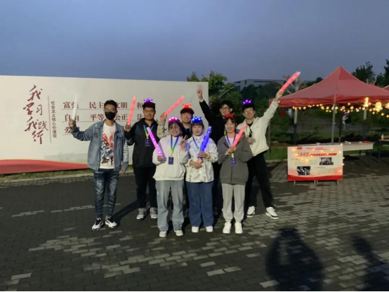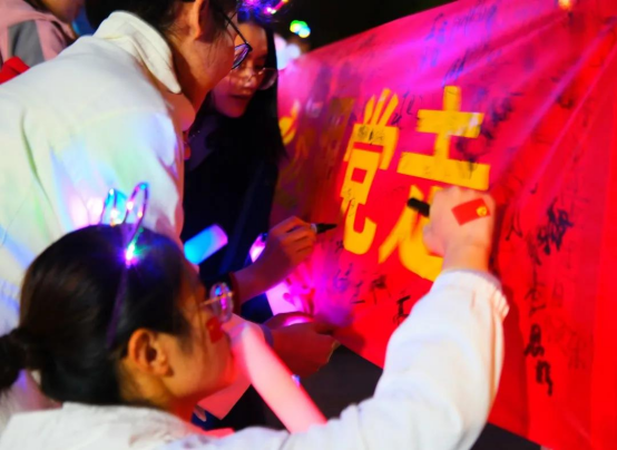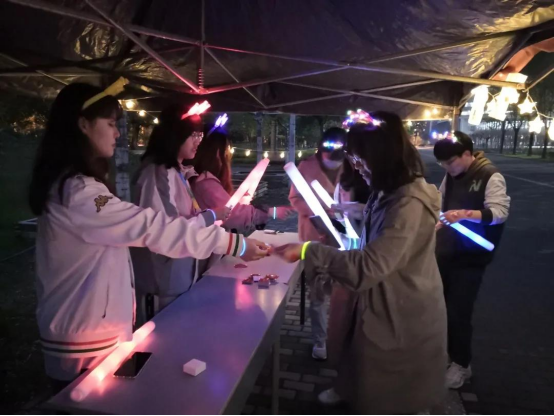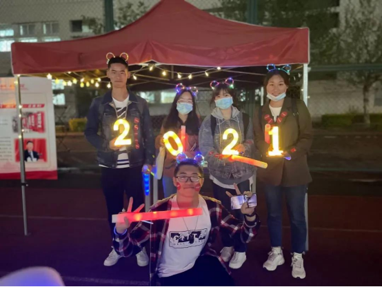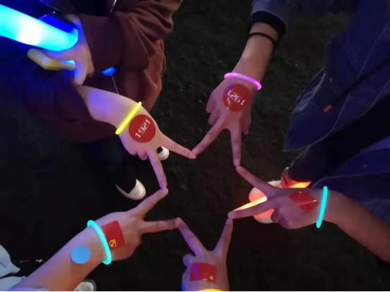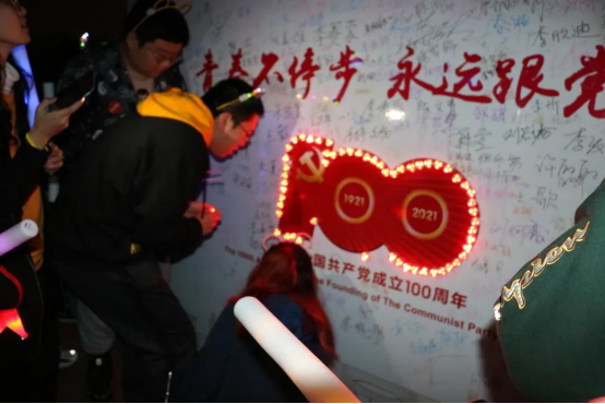 夜跑打卡结束后,在路线终点精心设置了党史学习活动区,开展猜灯谜、拼图答事件、歌词唱红歌等互动项目,同学们兴趣盎然、团结协作,完成了一个又一个任务,赢取活动纪念品的同时用手中的荧灯点亮主题展板上“100”的字样,向党的百年华诞献礼。