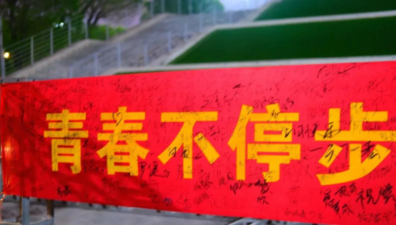 本次夜跑路线,分别在校园内设置1921、1949、1978、2012和2021五个点位, 同学们依次到各个点位学习党史故事、领取打卡贴纸、将自己的感悟和对党的祝福签署在主题横幅上。体育场出发,同学们伴随声声呐喊奋进争先;统计湖畔,微风徐徐,摇曳的明信片传递着莘莘学子的美好祝愿;主题草坪前,绿草葱郁,红歌响彻,唱出初心回响;综合体育馆台阶下,横幅舒展,“百年大党,风华正茂”的祝福不断汇聚。