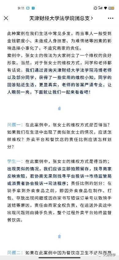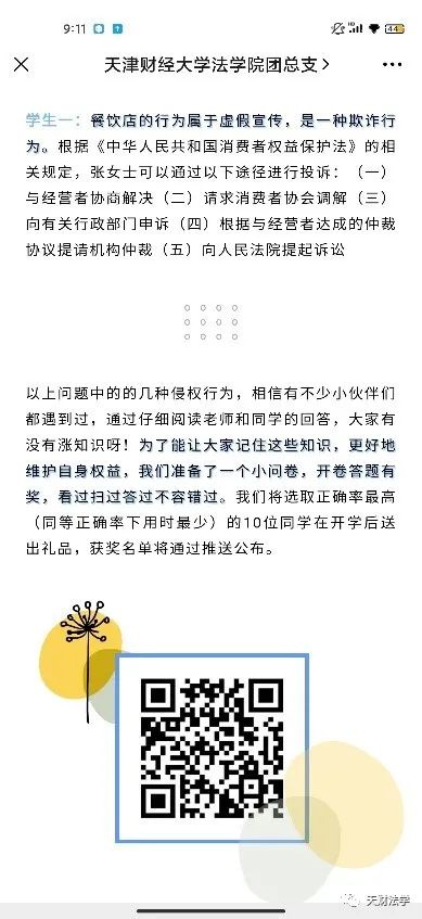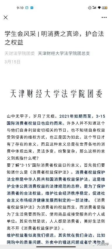 3月15日,天津财经大学大学生法律援助中心的同学们以国际消费者权益日为契机,结合民法典总则编、物权编、合同编、人格权编及侵权责任编等编章中对消费者权益保护的相关规定,采取专题推送和线上微信群普法的形式,向社区的居民们以及身边的同学和亲友们宣讲有关消费者权益的法律知识。结合外卖点餐中因食用不洁食物引发后续赔偿的案例,邀请法学院专业教师针对维权方式、维权途径等大家关切的问题给出专业解答,引导消费者养成学法依法、维法执法的习惯,同时提高维护自身权益的意识和能力。同时,为了加深同学和社区居民对相关知识的理解,激发学习热情,法律援助中心还开展线上答题活动,巩固和加深了受众对民法典知识的掌握程度。