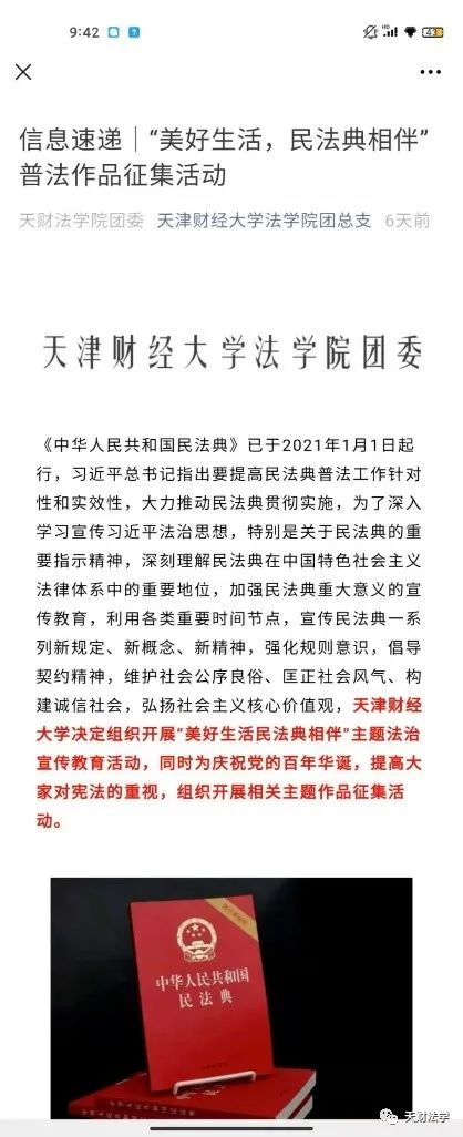 正值建党一百周年,未来,我校将继续立足专业学科特色,基于长期服务社会传统,注重将党史学习教育与法治宣讲实践紧密结合,开展好“百名师生诵党史”活动,通过师生党员共同诵读《百年法治进程中的人和事》,感悟我国法治建设不断完善的历程;组织好“百年司法看天津”活动,通过参观天津法院展览馆,实地感受司法推进的进程;推进好“百里走访践真知”活动,组织学生走访法院、律所等法律专业机构,持续开展常态化进社区、进基层普法宣传活动,积极依托学生暑期社会实践和学生党建实践活动,鼓励学生返乡面向农村、工厂等开展宣讲活动,为推动民法典普及宣传和法治精神的广泛弘扬,推动“十四五”时期全社会遵法、守法、学法、用法,贡献天财人的力量。