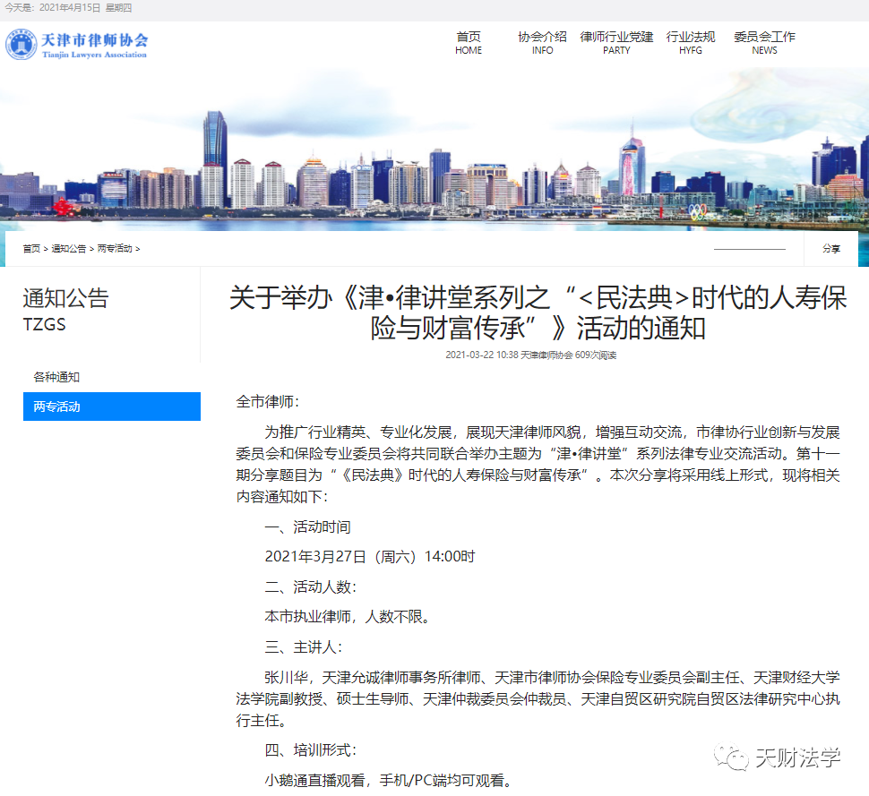 3月27日,应天津市律师协会的邀请,法学院张川华老师通过网络直播的形式,面向全天津市律师做“民法典时代的人寿保险与财富传承”专题宣讲,张老师围绕婚姻财产新规则、继承传承新动态、财富保护与传承等方面,针对信托保险、婚姻财产、房屋购买、继承形式和规则等具体问题进行了详细解读,帮助律师们深入理解民法典时代下的财富保护与传承相关规定,促进律师从业者专业化水平的提升。