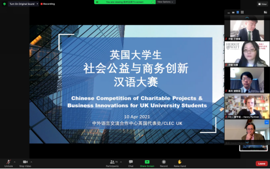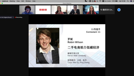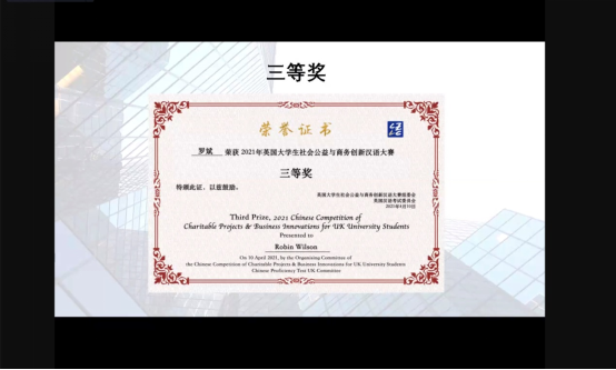 4月9日,由教育部中外语言交流合作中心英国代表处主办的“英国大学生社会公益与商务创新汉语大赛”在线上举行,共十六名选手参赛,全部来自开设商务汉语专业的英国大学和在英商务特色孔院。苏格兰商务与交流孔子学院指导并选送的选手罗斌,凭借精彩的商业计划演讲《二手电商助力低碳经济》和优秀的即兴答辩表现,获得了大赛三等奖和总分第四名的好成绩。罗斌同学也将获得由主办方提供五强选手的往返中国机票奖励及赴华实习工作的机会。