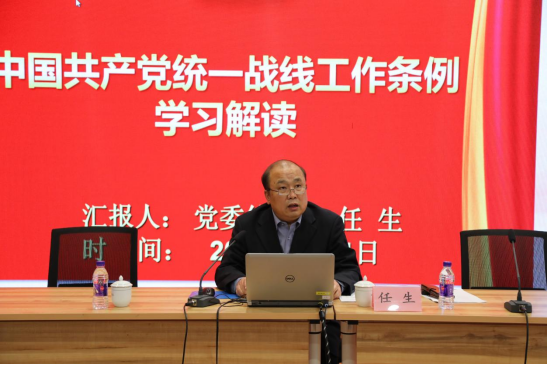 统战部任生部长就新修订的《中国共产党统一战线工作条例》进行了宣讲,并就2021年度学校统战重点工作进行部署。任部长从《条例》修订的背景、过程和意义,统一战线的重要地位和作用,加强党对统一战线工作的领导,各领域的统战工作主要任务和着力点,加强党外代表人士队伍建设,扎实做好《条例》的贯彻落实等六个方面,对《条例》进行了深入的解读。宣讲中,任部长将《条例》的学习宣讲与党史学习教育、与学校统一战线工作实践结合起来,追溯党的统一战线的历史沿革,回顾中国共产党领导统一战线的历史实践,梳理了我校统一战线的基本情况和“大统战”的工作格局,并就做好2021年度我校民主党派和无党派人士工作、党外知识分子工作、民族工作、宗教工作、港澳台侨工作等方面的工作任务进行了重点提示。