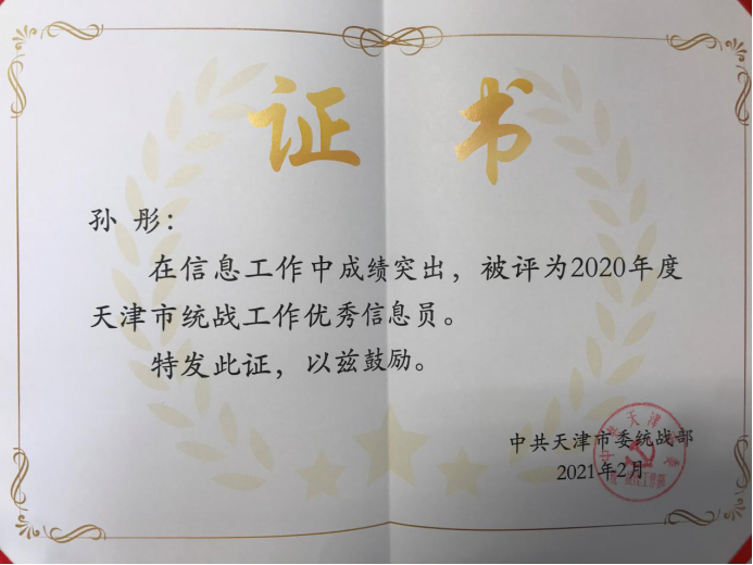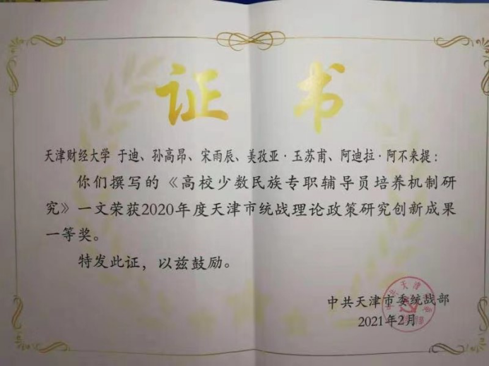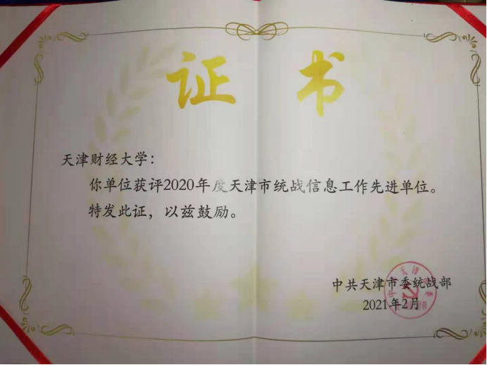 会上,天津财经大学、南开大学、天津商业大学、天津外国语大学等四所高校受到市委统战部的表彰。其中:我校荣获2020年度天津市统战信息工作先进单位,我校统战部干部孙彤被评为2020年度天津市统战工作优秀信息员;由我校学工部辅导员于迪、孙高昂、宋雨辰、美孜亚·玉苏甫、阿迪拉·阿不来提撰写的《高校少数民族专职辅导员培养机制研究》荣获2020年度天津市统战理论政策研究创新成果一等奖。