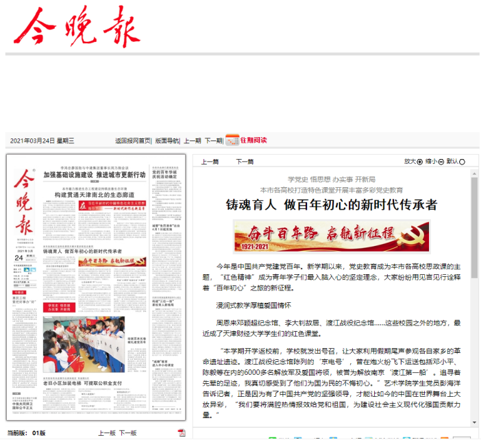 《天津日报》《天津教育报》报道艺术学子走进财大附小宣讲十九届六中全会精神。