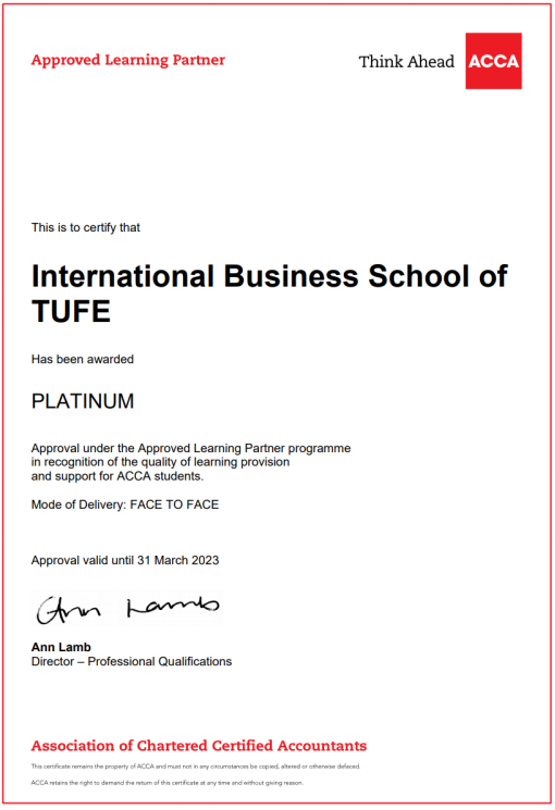 2022年3月29日,经过一系列的严格评审,我校获得ACCA(英国特许公认会计师公会)总部授予的全球最高等级认证——ACCA白金级教育机构资质。