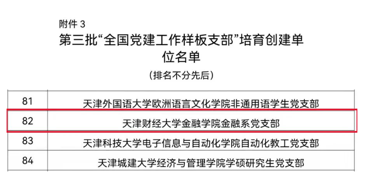 3月21日,教育部印发通知,公布第三批全国党建工作示范高校、标杆院系、样板支部培育创建单位名单。我校金融学院金融系党支部入选“全国党建工作样板支部”培育创建单位。