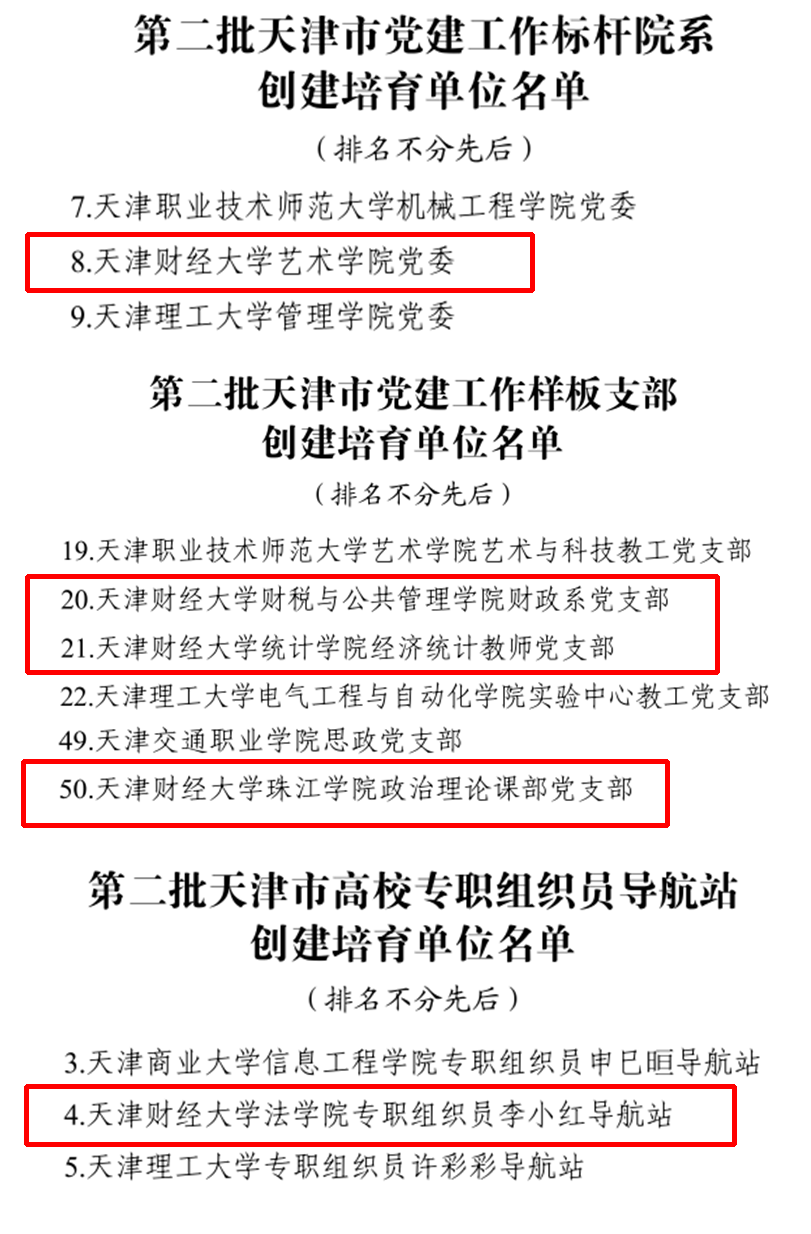 3月9日,市委教育工委市教委公布了第二批新时代天津市高校党建“领航工程“创建培育单位名单。我校艺术学院党委入选天津市党建工作标杆院系创建培育单位。财税与公共管理学院财政系党支部、统计学院经济统计教师党支部、珠江学院政治理论课部党支部入选天津市党建工作样板支部创建培育单位。法学院专职组织员李小红导航站入选天津市高校专职组织员导航站创建培育单位。