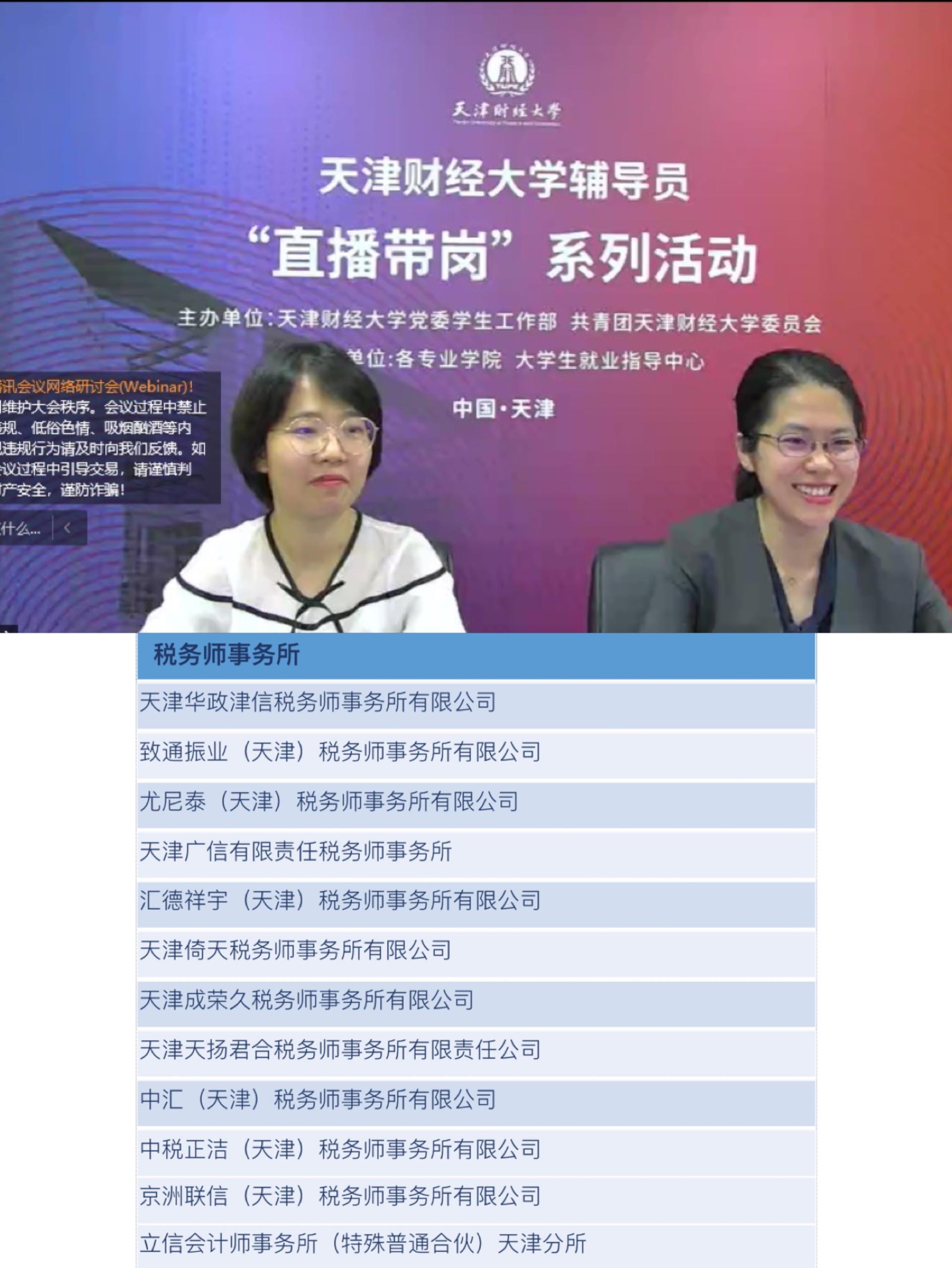 会后,天津市注册税务师协会与学院迅速落实各税务师事务所人才招聘需求,6月6日,迅即开展“天津财经大学辅导员直播带岗”活动,为三百余名学生带来13家税务师事务所共计335个就业岗位需求,有效的为2022届毕业生提供专业对口就业岗位,为推动高质量充分就业打下了良好的基础。