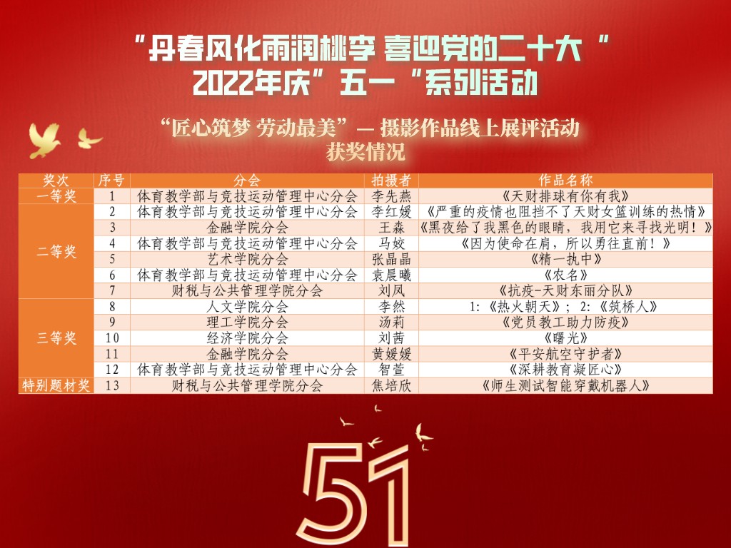 我校教职工积极参与,通过摄影镜头展示了各行各业劳动工作中的动人场景,期间共上传有效作品72幅,经天津市教育工会线上投票展评,我校教职工作品获得一等奖1幅、二等奖6幅、三等奖5幅、特别题材奖1幅。
