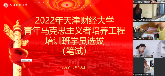 “天津市青年马克思主义者培养工程第六期培训班学员招生”校内选拔工作分为笔试和面试环节。按照校党委的部署,党委学生工作部、校团委主要负责同志担任面试评委。为充分保证选拔的公平公正,本次校内选拔笔试环节采用腾讯会议形式进行,所有候选同学均需开启双机位,校团委安排专人全程进行线上监考,统一发放及收取笔试试卷。
