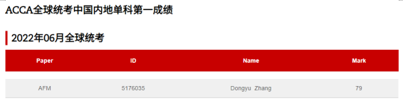 近日,ACCA中文官网公布喜讯,我校国际工商学院20级ACCA方向班张冬语同学在2022年6月举办的ACCA全球统一考试中,以79分的成绩获得Advanced Financial Management( 简称AFM)科目的中国内地第一。截至2022年6月考季,张冬语已经累计通过11门ACCA全球统一考试。
