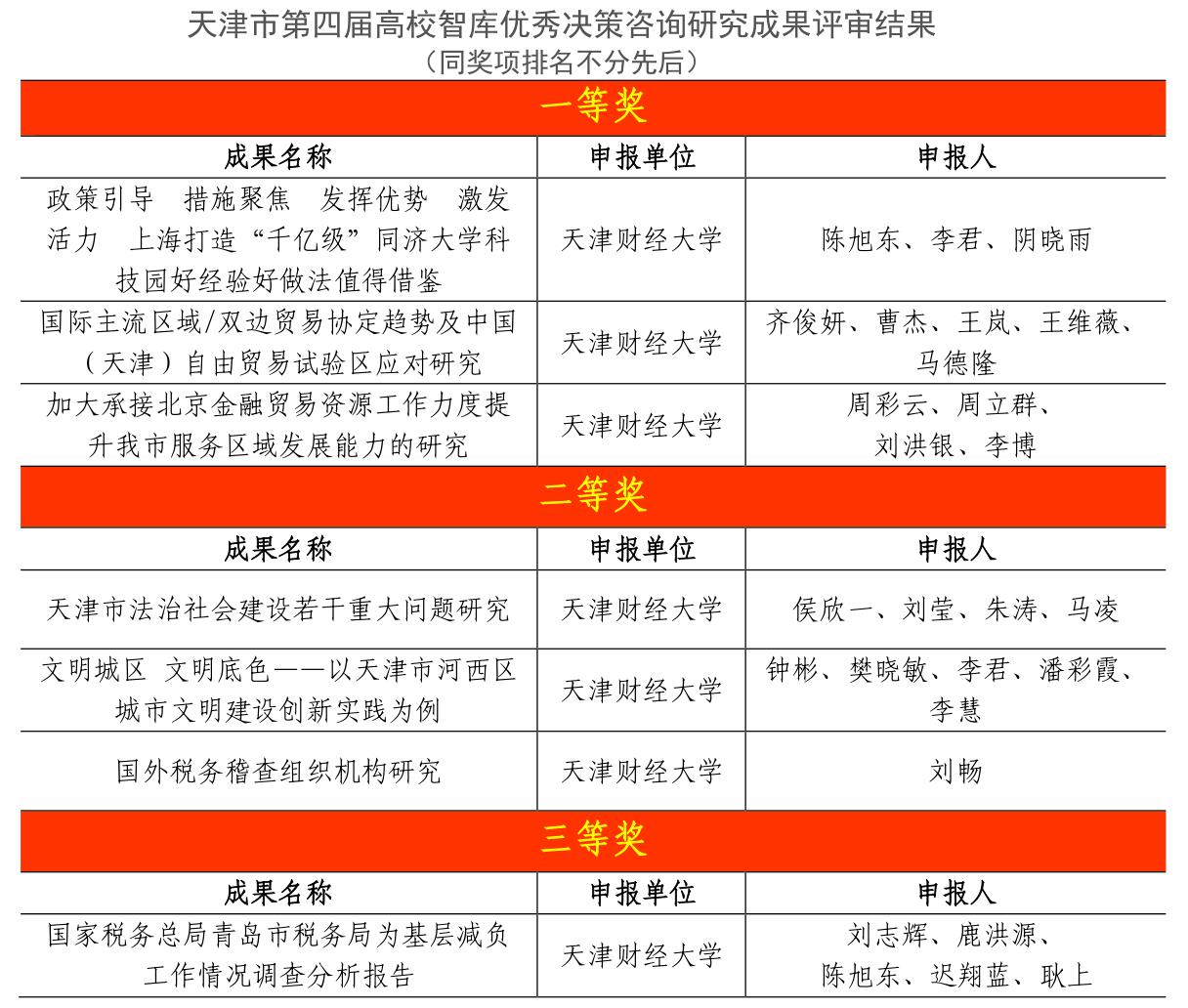 近日,天津市第四届高校智库优秀决策咨询研究成果评审结果正式公布,经公开申报、专家评审、社会公示等程序,我校共有7项决策咨询研究成果获奖。其中,一等奖3项,二等奖3项,三等奖1项,在一等奖获奖数量上实现突破。获奖结果如下:
