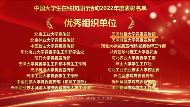 近日中国大学生在线发布校园新媒体、校网通及校园行活动2022年度表彰名单,我校党委宣传部连续两年获评中国大学生在线“2022年度校园新媒体互动百强”“2022年优秀校网通站”“优秀校园媒体人”“年度优秀内容”“校网通优秀指导教师”“2022年度校园行活动杰出指导教师”“2022年度校园行活动优秀组织单位”等多项荣誉称号。