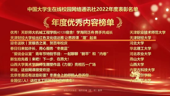 长期以来,天津财经大学自2020年10月中国大学生在线校园号建立以来,始终与教育部中国大学生在线同向同行,紧紧围绕教育部中国大学生在线的战略部署,构建立体化网络文化传播矩阵,夯实多元化网络作品培育体系,开展精品化网络文化主题活动,建强建好校园网络通讯站,做实做精在线共建工作。