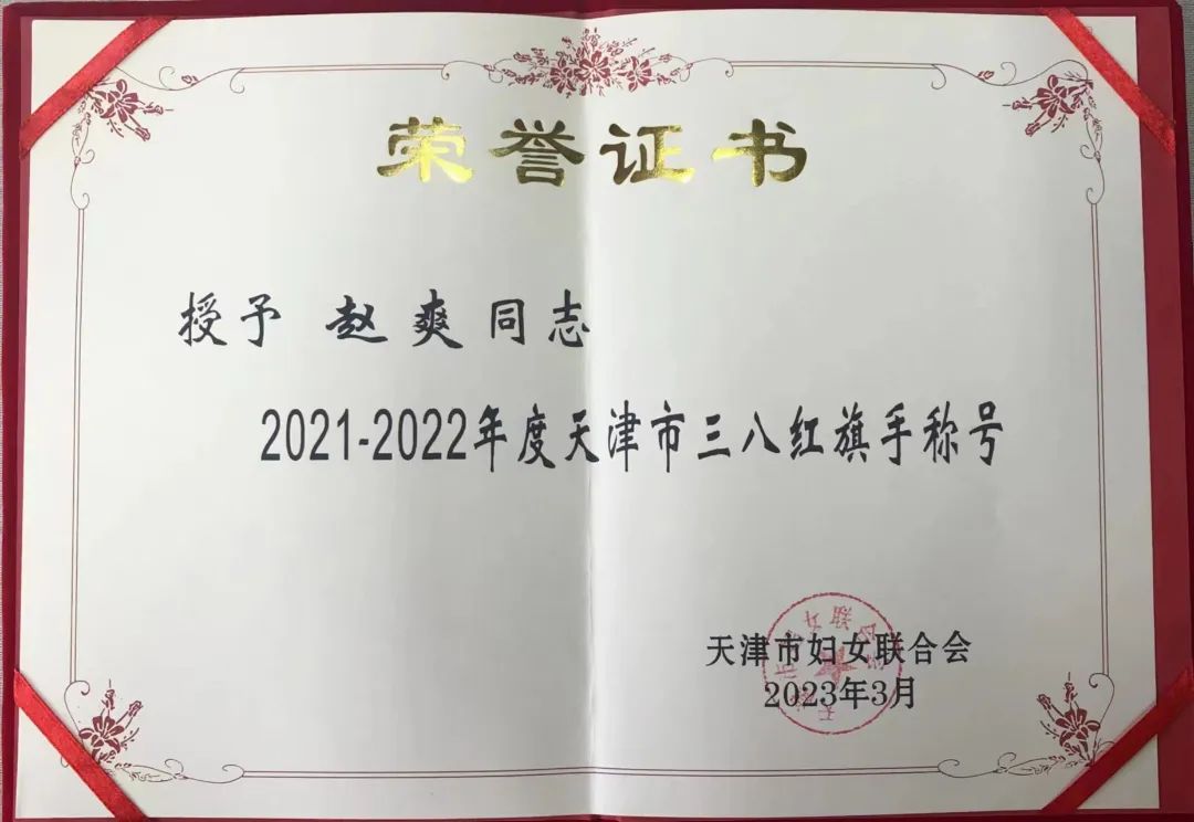 为表彰先进,树立榜样,引领广大妇女见贤思齐,近日,天津市妇女联合会正式发文表彰2021-2022年度天津市三八红旗手标兵和天津市三八红旗手(集体),我校经济学院辅导员赵爽同志荣获“天津市三八红旗手”荣誉称号。