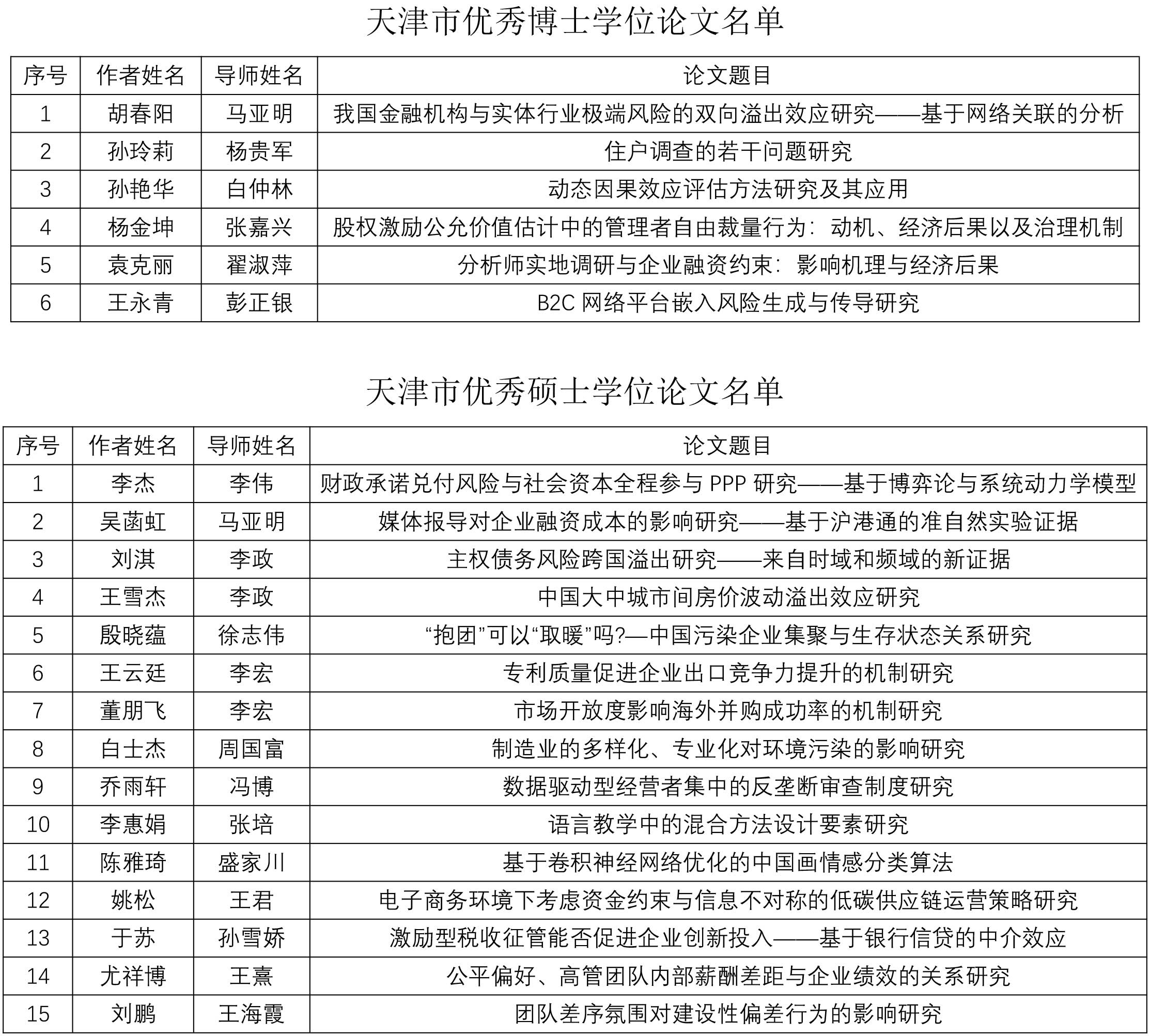 近日,天津市学位与研究生教育学会公布了2022年天津市优秀博士、硕士学位论文获奖名单,经研究生和导师申请,各学院、学位分委员会初评、天津市教育委员会评审,我校共有6篇博士学位论文被评选为市级优秀博士学位论文、共有15篇硕士学位论文被评选为市级优秀硕士学位论文。