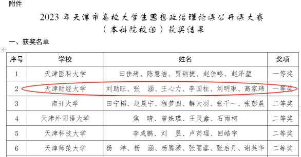 近日,天津市教育两委发布了2023年天津市高校大学生思想政治理论课公开课大赛获奖结果的通知,由马克思主义学院刘助旺等同学组成的团队,获本科院校组一等奖。