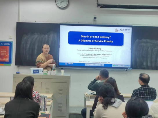 2023年12月12日,天津大学王钟彬副教授应邀来我校作了题为“Dine-in or Food Delivery? A Dilemma of Service Priority”的学术讲座,本次讲座由天津财经大学科学技术协会和管理科学与工程学院共同主办。