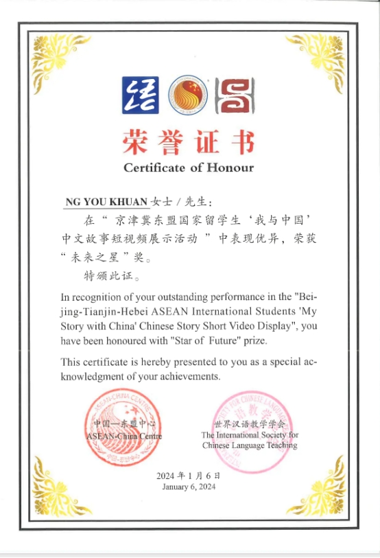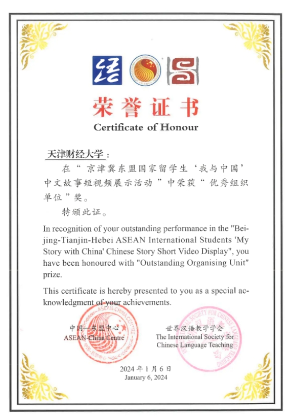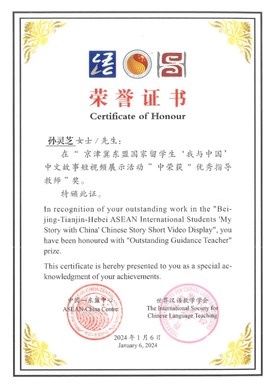 1月6日,首届京津冀东盟留学生“我与中国”中文故事短视频总展演活动在天津师范大学举办。天津市副市长张玲、教育部中外语言交流合作中心主任马箭飞、中国—东盟中心秘书长史忠俊、印度尼西亚共和国驻华大使周浩黎、北京外国语大学党委书记王定华、天津师范大学党委书记曲凯、河北师范大学副校长郭毅出席活动并致辞,来自京津冀教委(教育厅)、各参加学校获奖团队等1000多名师生代表一同参加活动。我校来自马来西亚的国际教育学院大四本科生黄有冠获得“未来之星”奖,孙灵芝老师获得“优秀指导教师”奖,我校荣获“优秀组织单位”奖。获奖留学生和指导教师受邀参加展演及颁奖仪式。