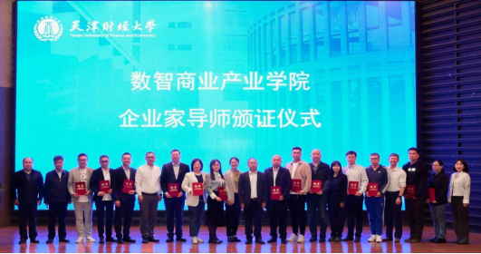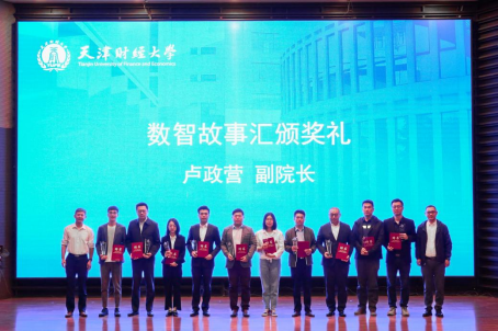 在数智产教融合发展环节中,卢政营副院长总结并讲述了数智新产业融合方面的十个数智故事,通过利顺德“数字统计机”、一汽大众“螺栓身份证”、天士力新一代数智中国茶、海河数字“人才有价”数字评估系统、中化MAP beSide“数字戳”、五大道“数字人民币试验区”、NEW VERSE“数字钱包”、天津港“AI训练师(ART)”、松昌集团WIFFA“云帆奖”、壹刻校园“AIGC文创”等10个生动案例展现了“数字也动人”的新鲜活力和企业家在数智商业方面的探索及贡献,刘玉斌书记和张建宇院长为10位企业家颁发了天津财经大学数智商业产业学院第一届数智故事荣誉奖。