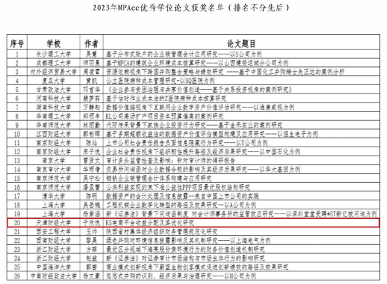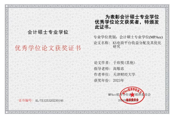 近日,全国会计专业学位研究生教育指导委员会(以下简称MPAcc教指委)公布了2023年会计硕士专业学位优秀学位论文评选结果。会计学院高敬忠教授指导的会计专业硕士研究生于欣悦同学的学位论文《KS电商平台收益分配及其优化研究》获得2023年“会计硕士专业学位优秀学位论文奖”。