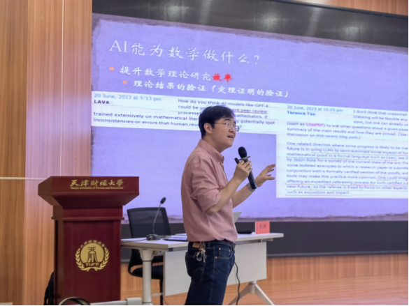 为深入学习宣传贯彻习近平总书记视察天津重要讲话精神,践行“四个善作善成”,落实加快发展新质生产力要求,5月10日,新质生产力与新财经名家讲堂(第二期)暨第二十二届天津市社会科学普及周讲座成功举办。本期名家讲堂邀请到北京国际数学研究中心长聘教授、国际机器学习研究中心副主任、国家生物医学成像科学中心研究员、北京大学长沙计算与数字经济研究院副院长、求是杰出青年学者董彬教授作题为《AI for Mathematics》专题讲座。讲座由我校科研处处长、产业创新融合发展研究院秘书长刘乐平主持。此次名家讲堂由党委宣传部、科研处、科技创新与成果转化办公室、中国制度型开放研究院、产业创新融合发展研究院主办,理工学院、管理科学与工程学院和智能计算与新财经研究中心协办。
