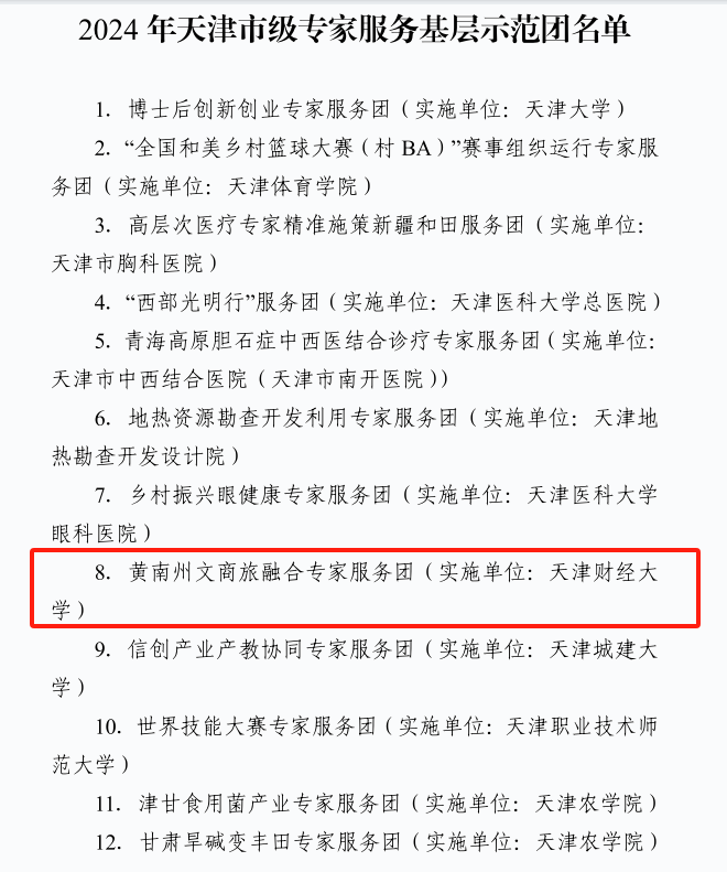 近日,天津市人力资源与社会保障局发布了2024年专家服务团和国家级专家服务基地名单的通知,由我校财税与公共管理学院牵头,联合商学院共同申报的“青海省黄南州同仁市文商旅融合发展专家服务团”,成功入选2024年天津市级专家服务基层示范团。