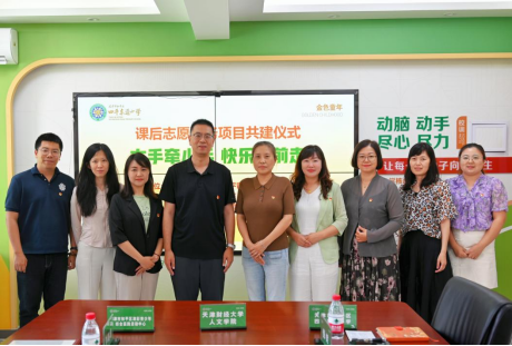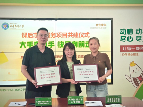最后,人文学院党委副书记孙高昂、天津市和平区四平东道小学党总支书记黄鸣、和平区津彩青少年综合实践活动中心主任董盈代表三方签署共建合作协议,并进行了揭牌仪式。