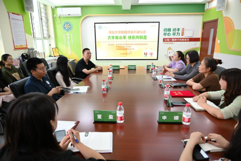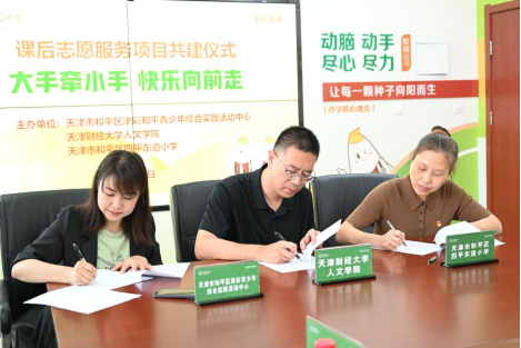 为深入学习贯彻习近平总书记视察天津重要讲话精神,落实习近平总书记关于志愿服务的系列重要指示批示精神,聚焦立德树人根本任务,强化志愿服务基地矩阵效应,持续推进大中小学思政教育一体化建设。5月17日,天津财经大学人文学院、和平区四平东道小学、和平区津彩青少年综合实践活动中心三方共建的“大手牵小手 快乐向前走”课后志愿服务基地签约揭牌仪式在和平区四平东道小学成功举办。共青团天津市和平区委员会青发部部长郝爽,天津市和平区四平东道小学党总支书记黄鸣、校长焦茹、校党总支副书记马燕、副校长石爽、德育主任倪妮,天津财经大学人文学院党委副书记孙高昂、人文学院团委书记袁峥,和平区津彩青少年综合实践活动中心主任董盈以及部分师生代表出席了此次签约揭牌仪式。